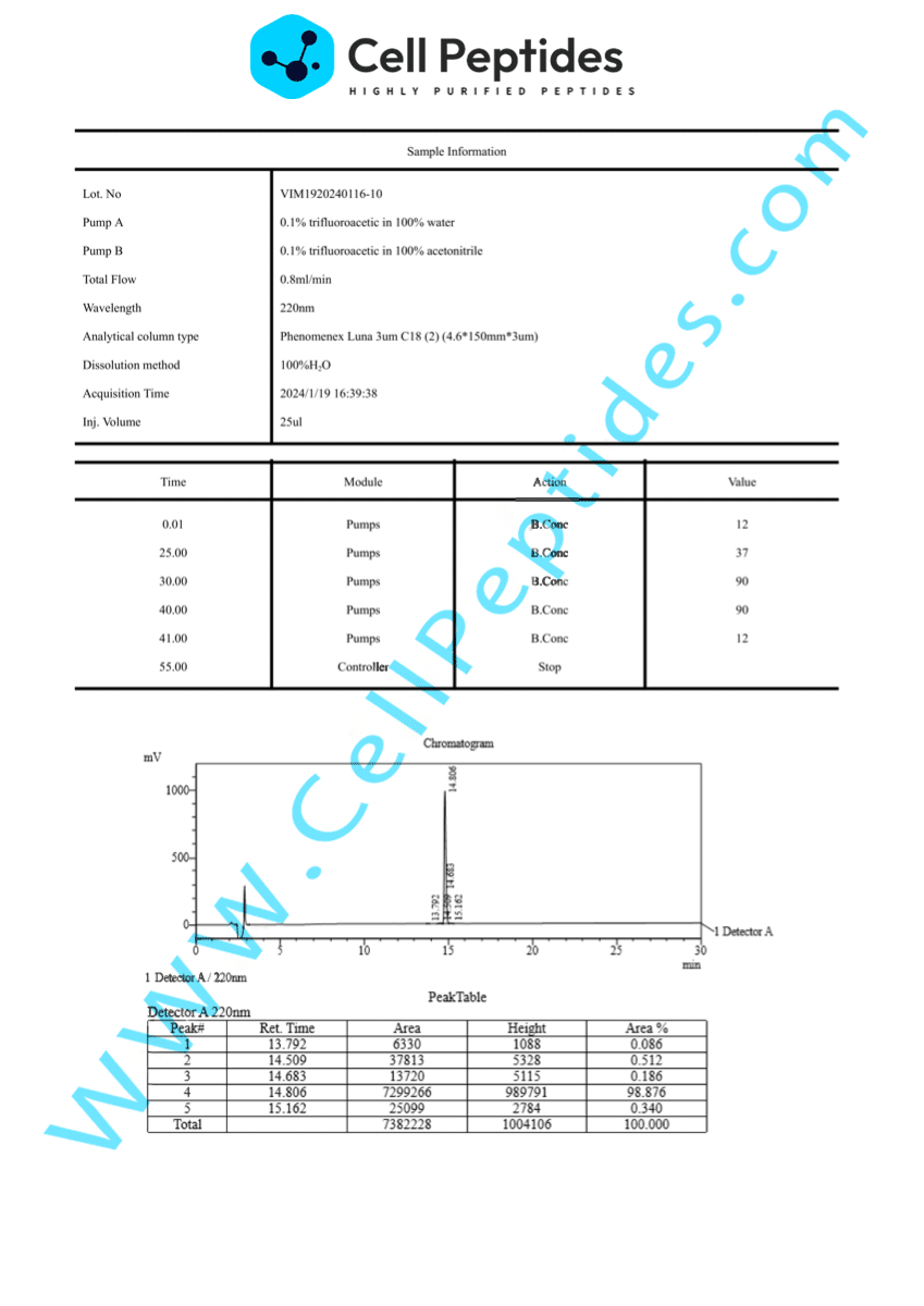 • Synthesized to replicate the exact 28-amino acid sequence (C129H215N33O55) of endogenous Tα1.